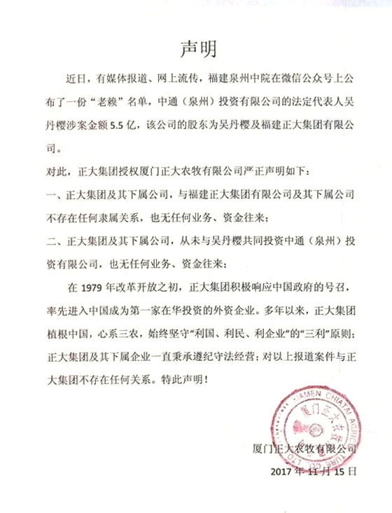 近日,有媒體報道、網(wǎng)上流傳,福建泉州中院在微信公眾號上公布了一份“老賴”名單,中通(泉州)投資有限公司的法定代表人吳丹櫻涉案金額5.5億,該公司的股東為吳丹櫻及福建正大集團(tuán)有限公司。對此廈門正大農(nóng)牧有限公司發(fā)布聲明,內(nèi)容如下: