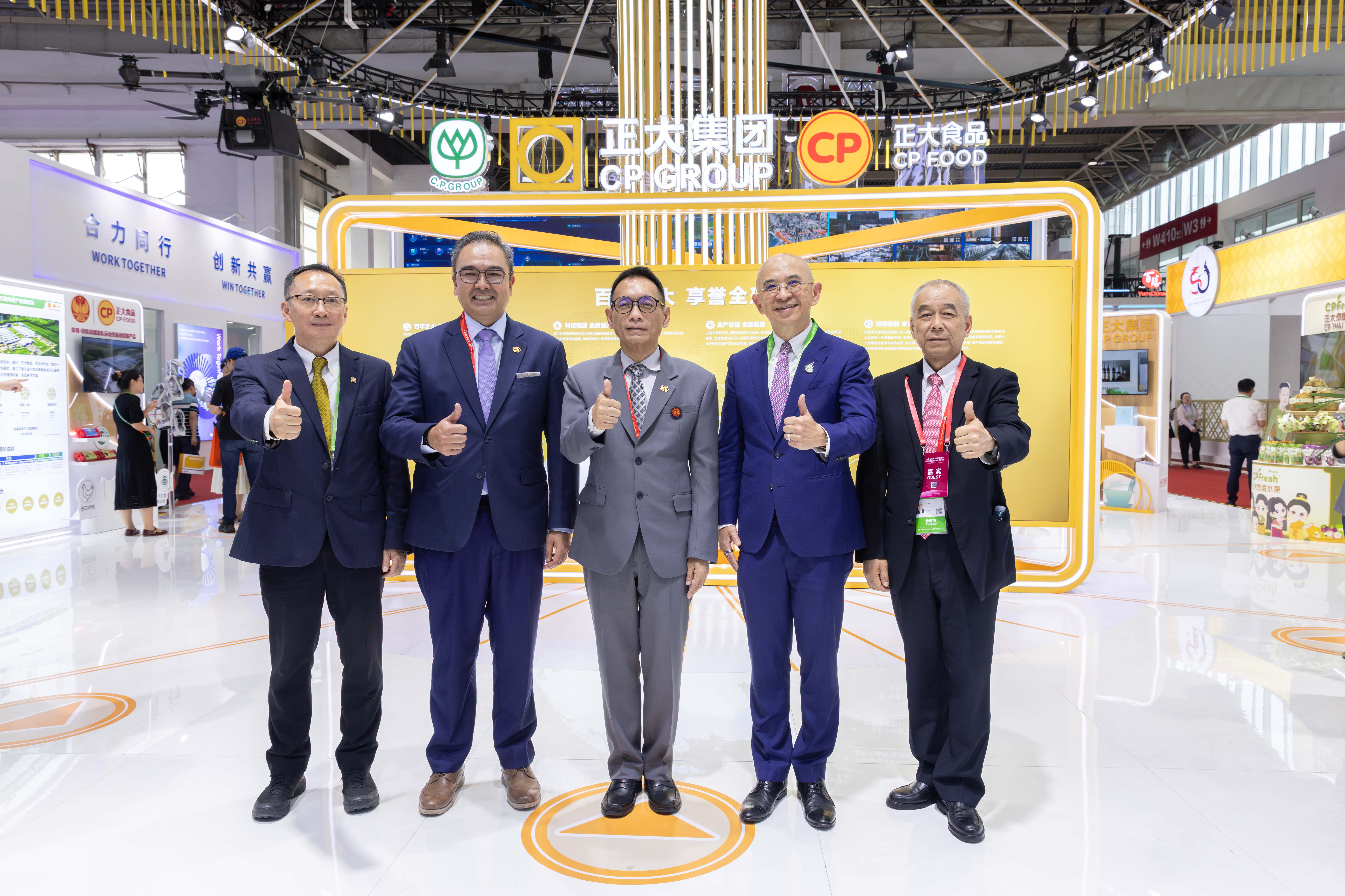 泰國商務部副次長艾卡闡·斯達瓦拉瀾(中)一行參觀正大展館,正大集團中國區財務長楊森源(右二)熱情接待泰國政府來賓,集團農牧食品企業中國區資深副董事長薛增一(右一)、中國區市場中心資深總裁張曙暉(左一)陪同接待并一同合影留念。