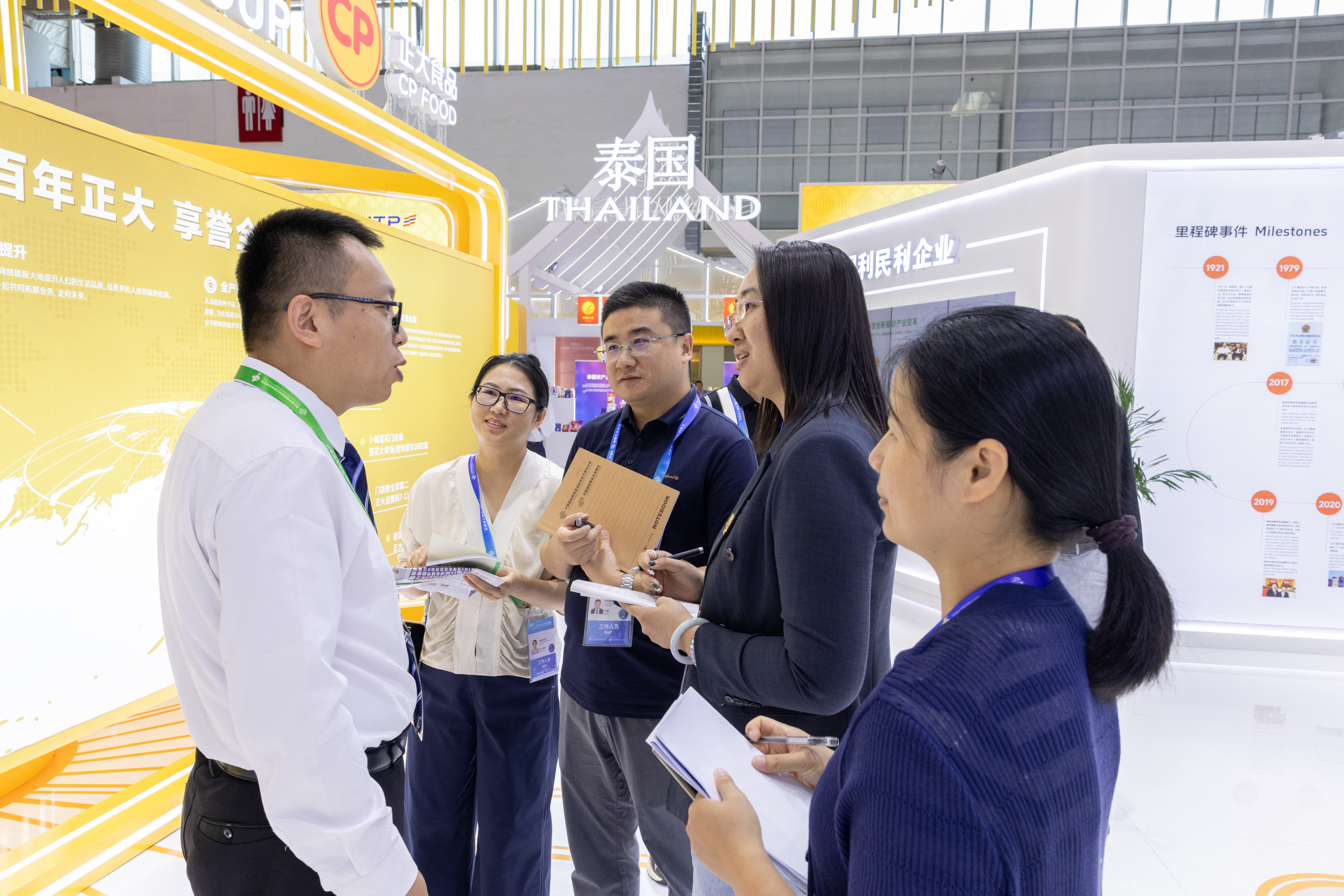麥當勞合作伙伴展團一行參觀正大展館,正大集團農牧食品企業中國區市場中心品牌傳播經理孟徽(左一)熱情接待來賓。