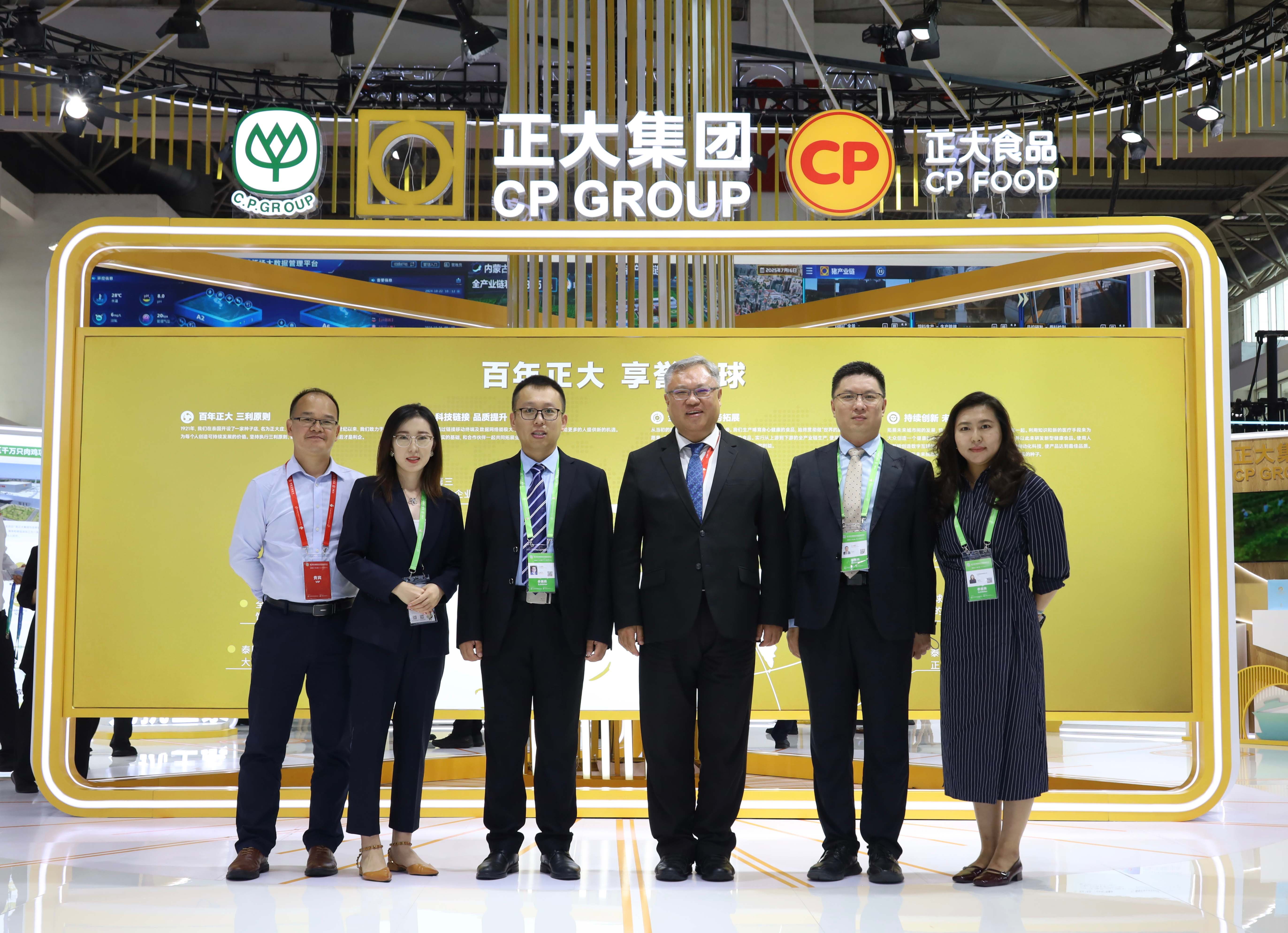 中糧集團對外合作部總監陳剛(右三)一行參觀正大展館,正大集團農牧食品企業中國區食品研發中心總裁王冶(右二)、王恩川副總裁(左三)、正大北京戰區市場部總監周賀(左二)等熱情接待來賓并合影留念。